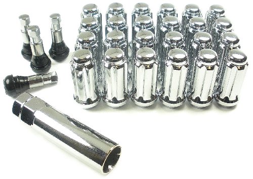 - Kit includes 24 each 14 millimeter x 1.5 inch spline designed truck application lug nuts with matching installation socket and 4 chrome valve stems